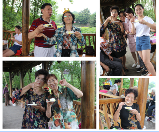 走过流水潺潺的湿地公园我们的重头戏才刚刚开始,早在紫藤苑等待大家的工作人员已经准备好了生日蛋糕。大家在这里用歌声为六月的寿星们送去满满祝福,用蛋糕为寿星们送去甜蜜,还有亲睦家特别准备的贴心小礼物,让每位寿星都非常开心。寿星们一起许愿吹蜡烛,诉说他们的感受。
