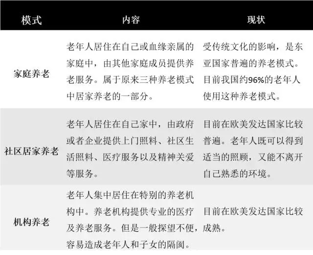 我们也认为,没有必要对居家养老和社区养老做一个严格区分。社区养老其实也就是居家养老,归根到底还是居家养老的一种延展形式。因此,我们也可以将居家养老和社区养老统称为“社区居家养老”。我们将养老模式重新划分为如下三种: