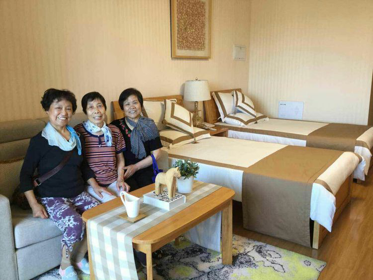 亲睦家·鹭湖健康公寓的车,早上8点过就到分院大门口接我们。九点正准时出发,45分钟的路程就到达目的地。受到工作人员的热情欢迎。首先,客户经理带着我们参观了适合不同客户需求的几种类型的房间内部设施和配置;参观了与之配套的诊所、老年大学、电影院、室内外康乐设施、理发室等。看到干净舒适的舞蹈室,涣起了队友们想跳一跳的激情。于是,我们从11:00开始活动,做八段锦、健骨操,再跳几支舞蹈。听着优美的旋律,动动胳膊腿,放飞心情,倍爽!40分钟的锻炼结束了,准备吃午餐!